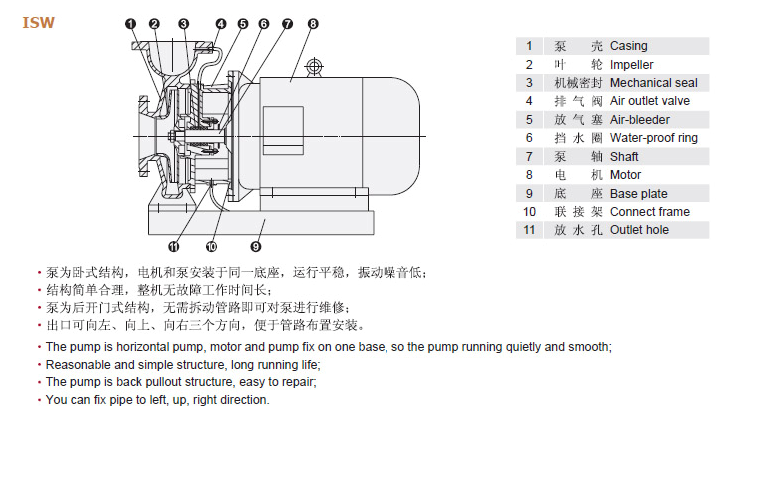 3、ISWH型卧式化工泵,供输送不含固体颗粒,具有腐蚀性,粘度类似于水的液体,适用于石油、化工、冶金、电力、造纸、食品、制药和合成纤维等部门,使用温度T:-20℃-120℃。