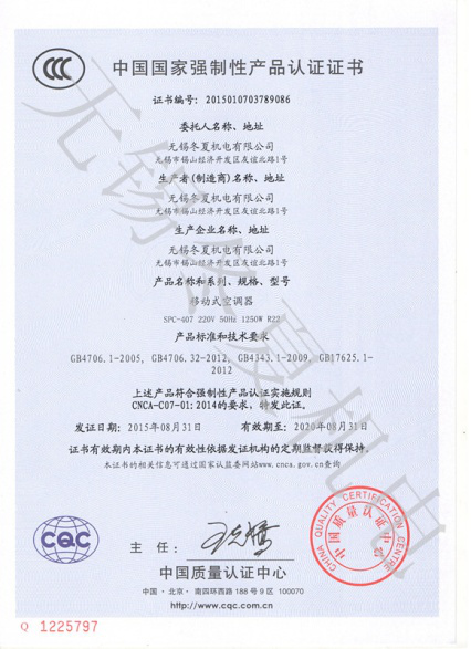 近日,深圳逍遥个人护理培训有限公司的移动工业冷气机、暖风机产品7个型号取得了中国质量认证中心颁发的3C强制认证证书。
